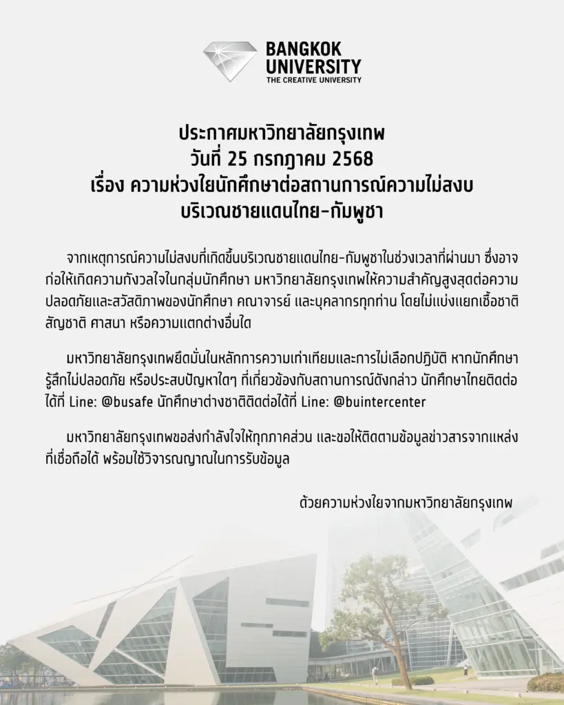 ประกาศมหาวิทยาลัยกรุงเทพ วันที่ 25 กรกฎาคม 2568 เรื่อง ความห่วงใยนักศึกษาต่อสถานการณ์ความไม่สงบ บริเวณชายแดนไทย-กัมพูชา 25 Jul 202525 Jul 2025 Admin ประกาศมหาวิทยาลัย