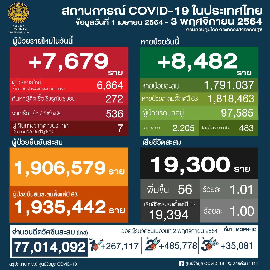 (ข้อมูล ณ วันที่ 3 พฤศจิกายน 2564) ขอขอบคุณ แหล่งข้อมูล: ศูนย์บริหารสถานการณ์ โควิท-19 (ศบค.)