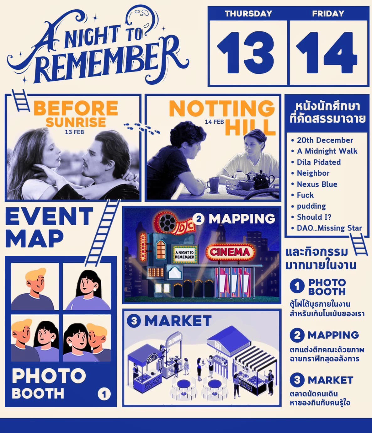 จะพาทุกคนเข้าสู่บรรยากาศที่อบอวลไปด้วยความรักของผู้คนที่หลงรักภาพยนตร์ ในค่ำคืนแห่งความรัก และมาร่วมสร้างความทรงจำดีๆร่วมกันในงาน ผ่านกิจกรรมมากมายไม่ว่าจะเป็นตลาดนัดคนกอง ร้านค้าอาหาร และของที่ระลึกมากมายที่ทุกคนจะได้รับกลับไป