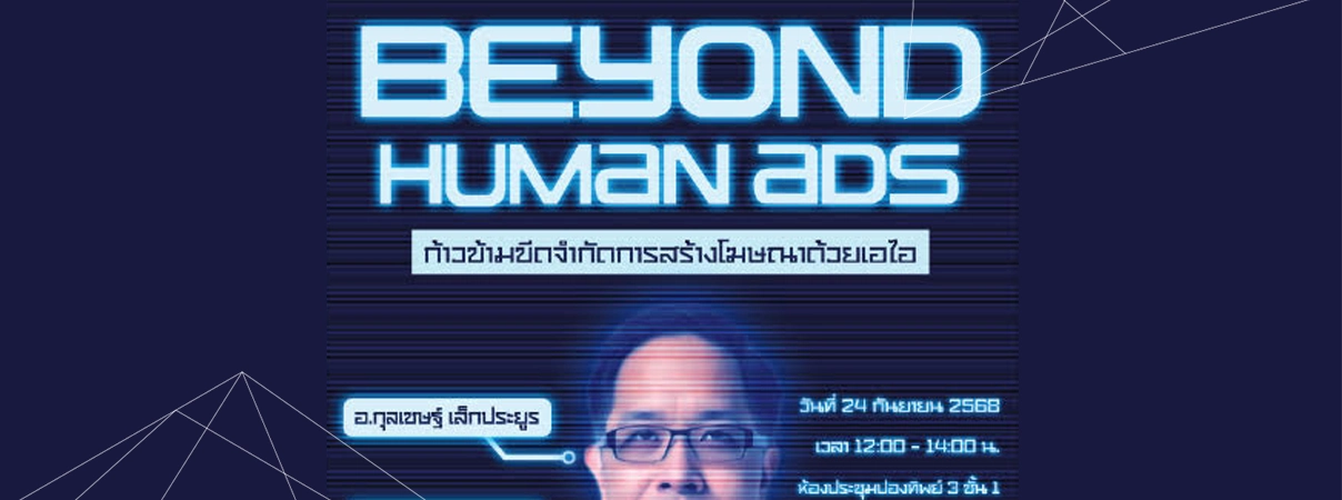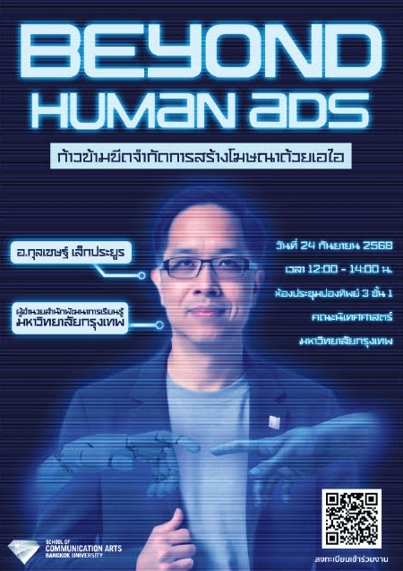 งานสัมมนา Beyond Human Ads ที่จัดขึ้นในครั้งนี้เป็นส่วนหนึ่งของหลักสูตรนิเทศศาสตร์ มหาวิทยาลัยกรุงเทพ โดยมีวัตถุประสงค์เพื่อให้ได้เรียนรู้เทคโนโลยีใหม่ ก้าวข้ามขีดจำกัดการสร้างสื่อโฆษณาด้วย AI