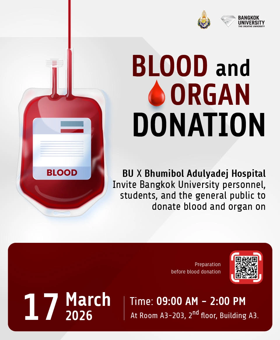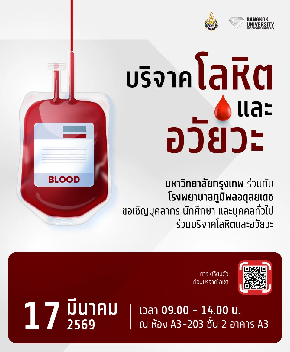 มหาวิทยาลัยกรุงเทพ ร่วมกับโรงพยาบาลภูมิพลอดุลยเดช ขอเชิญบุคคลากร นักศึกษาและบุคคลทั่วไปร่วมบริจาคโโลหิตและอวัยวะ