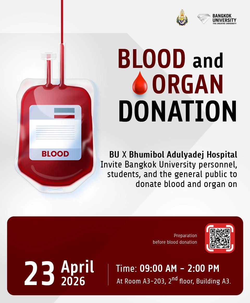 มหาวิทยาลัยกรุงเทพ ร่วมกับโรงพยาบาลภูมิพลอดุลยเดช ขอเชิญบุคคลากร นักศึกษาและบุคคลทั่วไปร่วมบริจาคโโลหิตและอวัยวะ