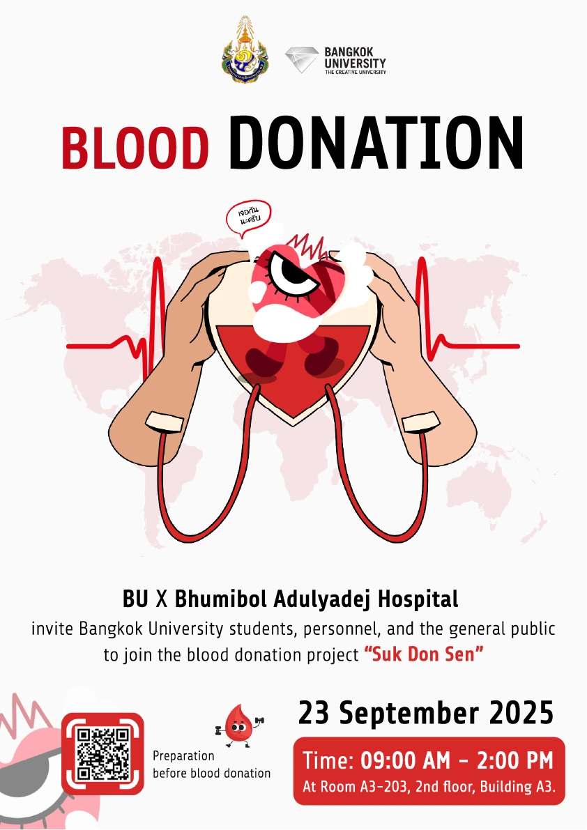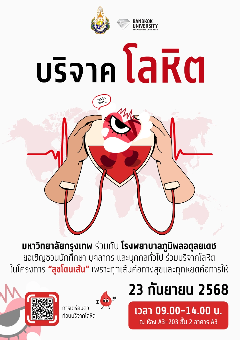 มหาวิทยาลัยกรุงเทพ ร่วมกับโรงพยาบาลภูมิพลอดุลยเดช ขอเชิญนักศึกษา บุคคลากร และบุคคลทั่วไปร่วมบริจาคโลหิต