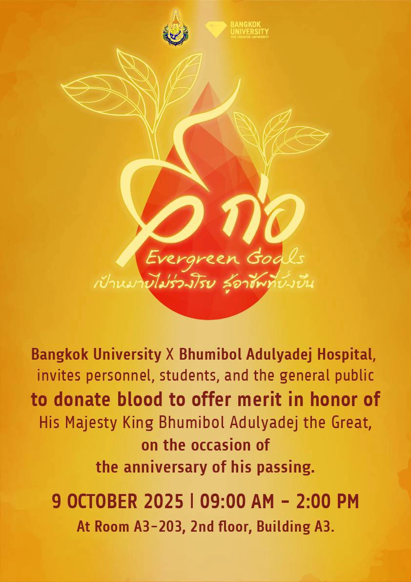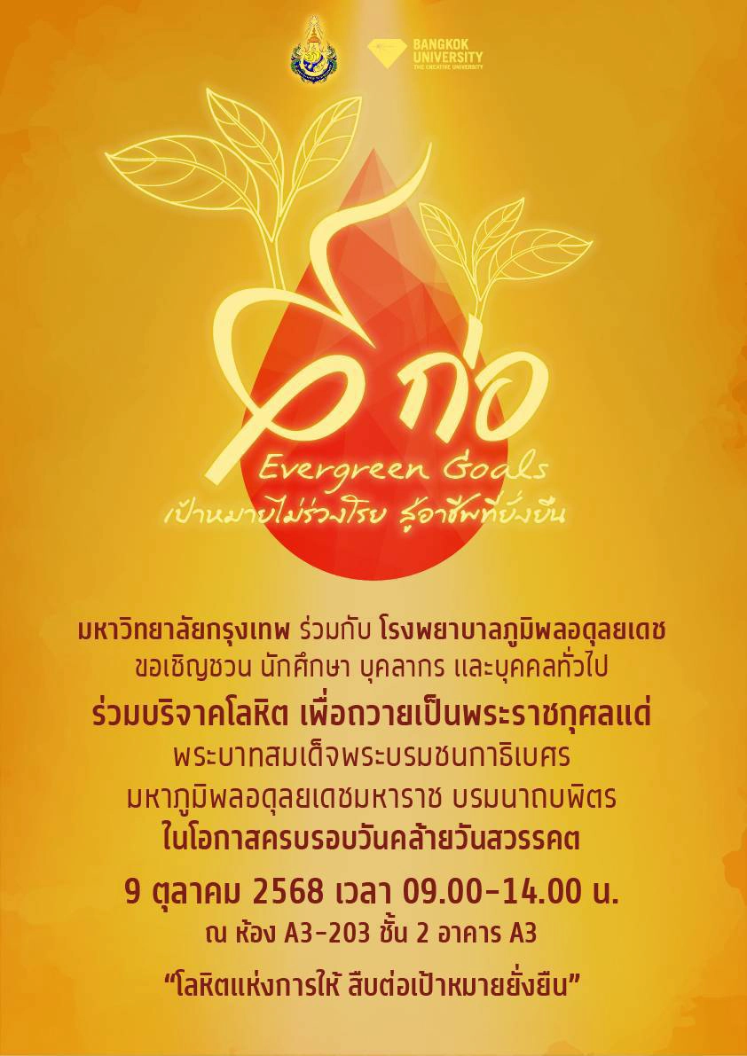 มหาวิทยาลัยกรุงเทพ ร่วมกับโรงพยาบาลภูมิพลอดุลยเดช ขอเชิญบุคคลากร นักศึกษาและบุคคลทั่วไปร่วมบริจาคโลหิตและอวัยวะ