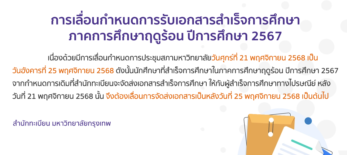 - การแจ้งจบการศึกษาทางอินเทอร์เน็ต (กำหนดการแจ้งจบ ภาคที่ 1/2568 วันที่ 18 ส.ค. – 20 ธ.ค. 68)